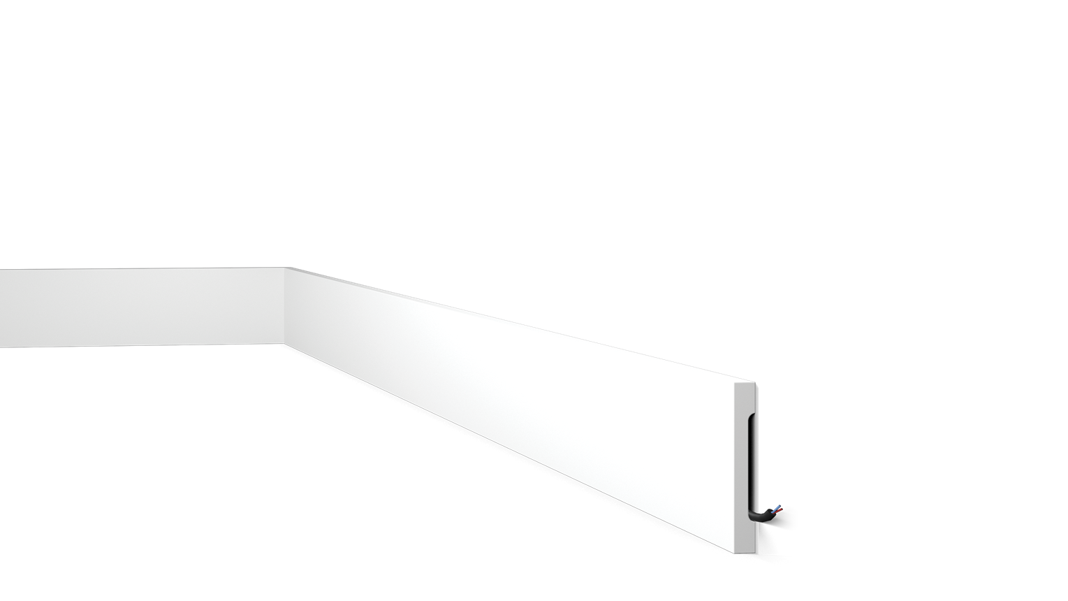 Mit direkter oder indirekter Beleuchtung kombinierbare Decken-, Wand- und Sockelleisten sowie Wanddekoraktionselemente.