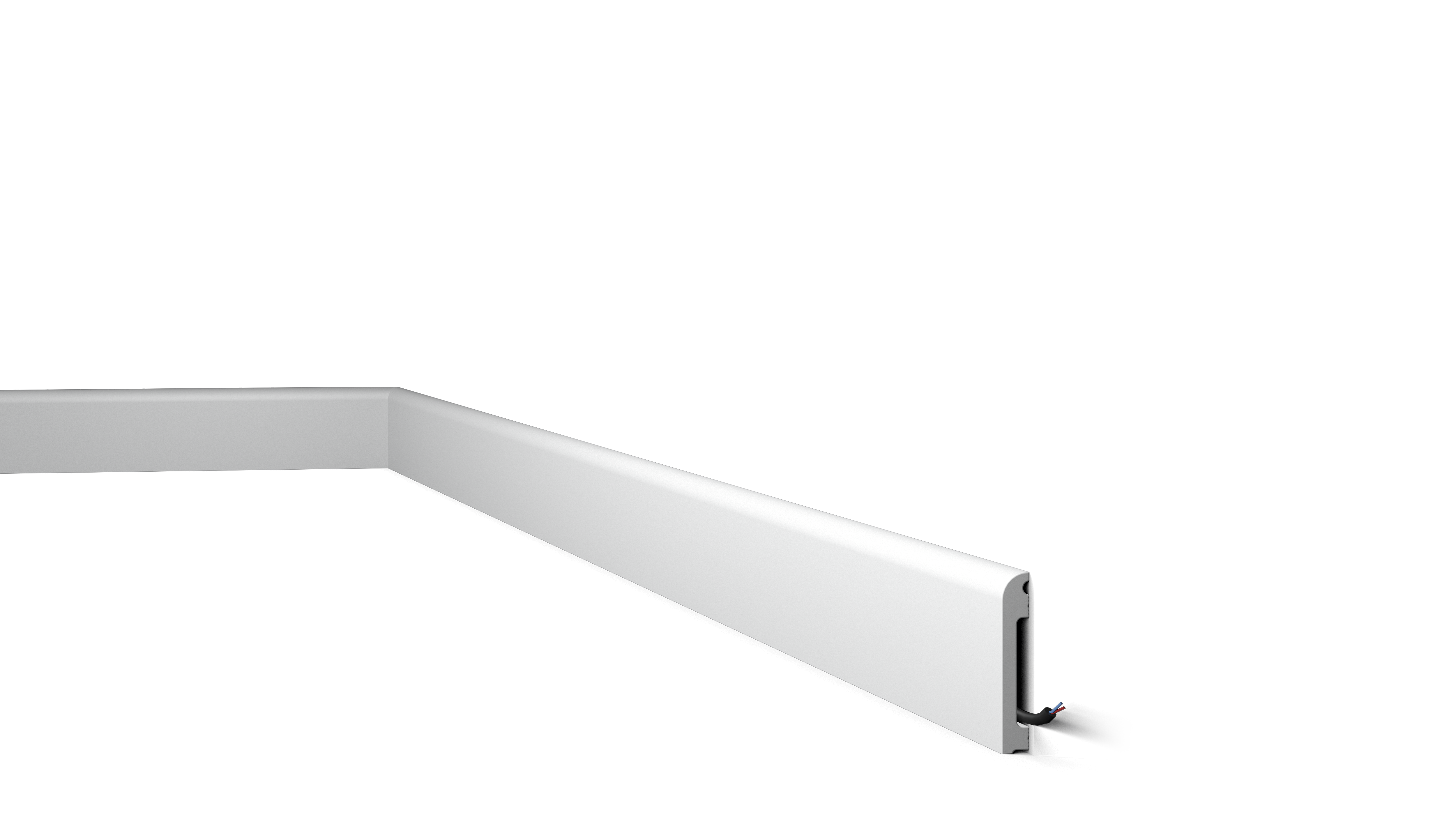 Mit direkter oder indirekter Beleuchtung kombinierbare Decken-, Wand- und Sockelleisten sowie Wanddekoraktionselemente.