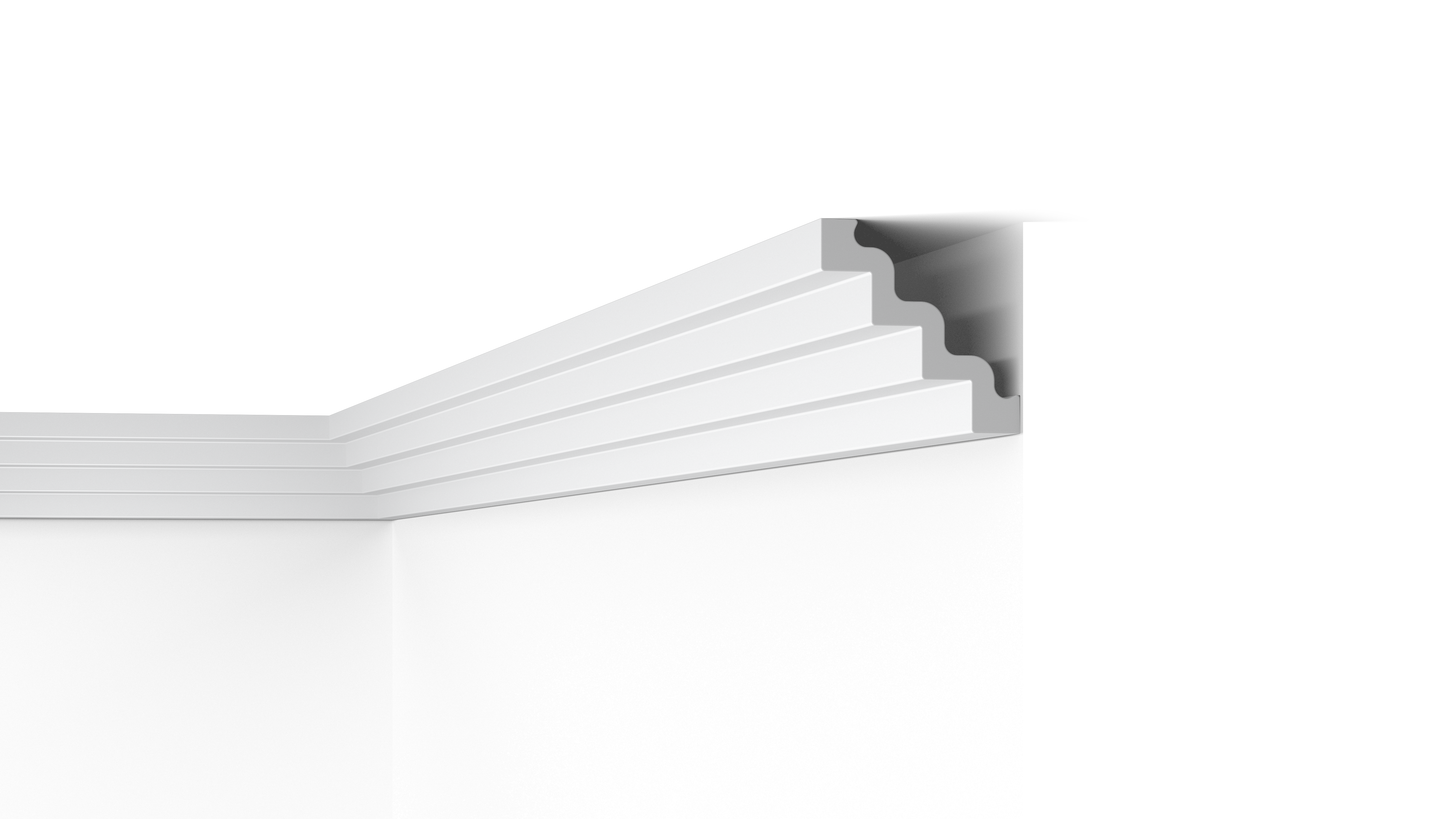 Die ST4 NOMASTYL® Deckenleiste hat ein kubisches, abgestuftes Design, das die Kreativität eines Raumes unterstreicht. Durch die Form der Deckenleiste entstehen starke Linien und Schatten, die dem Raum Dimension verleihen.