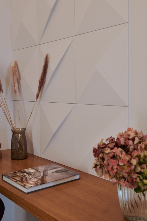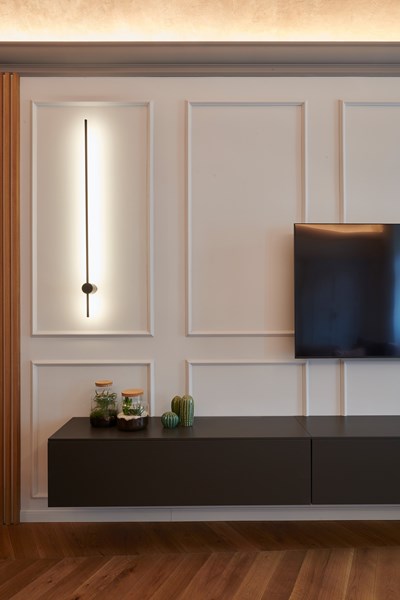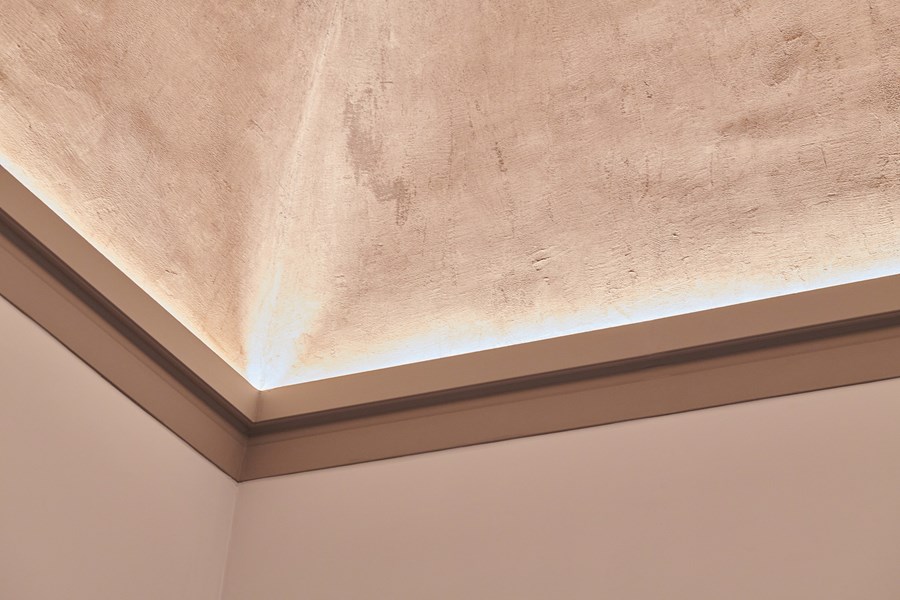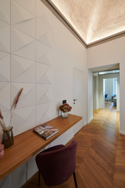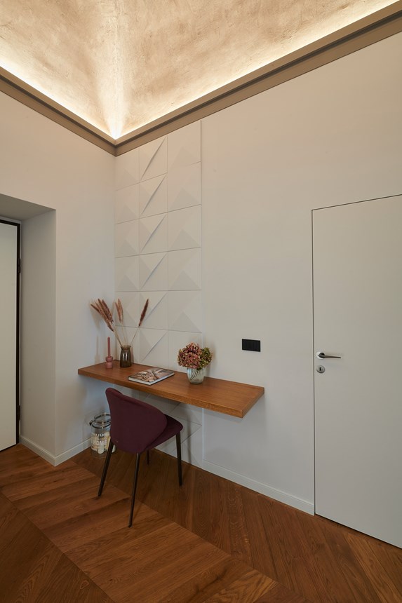 Por este motivo, en varias habitaciones del piso se han colocado perfiles que combinan armoniosamente con los elementos históricos de estuco. En el vestíbulo, se utilizó un marco de perfiles para iluminación indirecta (IL 9 MEMORY) para resaltar y destacar el techo abovedado. En la pared, los elementos de pared PUZZLE le dan carácter. Este elemento de diseño tridimensional puede aplicarse de diferentes maneras, aportando mucha individualidad.