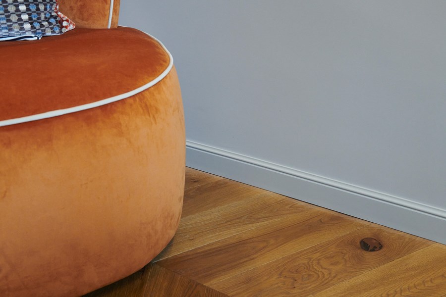 La cuidadosa selección de perfiles se complementa con los zócalos FL1 WALLSTYL, que también son del mismo color que la pared para darle continuidad. Los zócalos armonizan con el parquet de alta calidad sin resultar molestos.