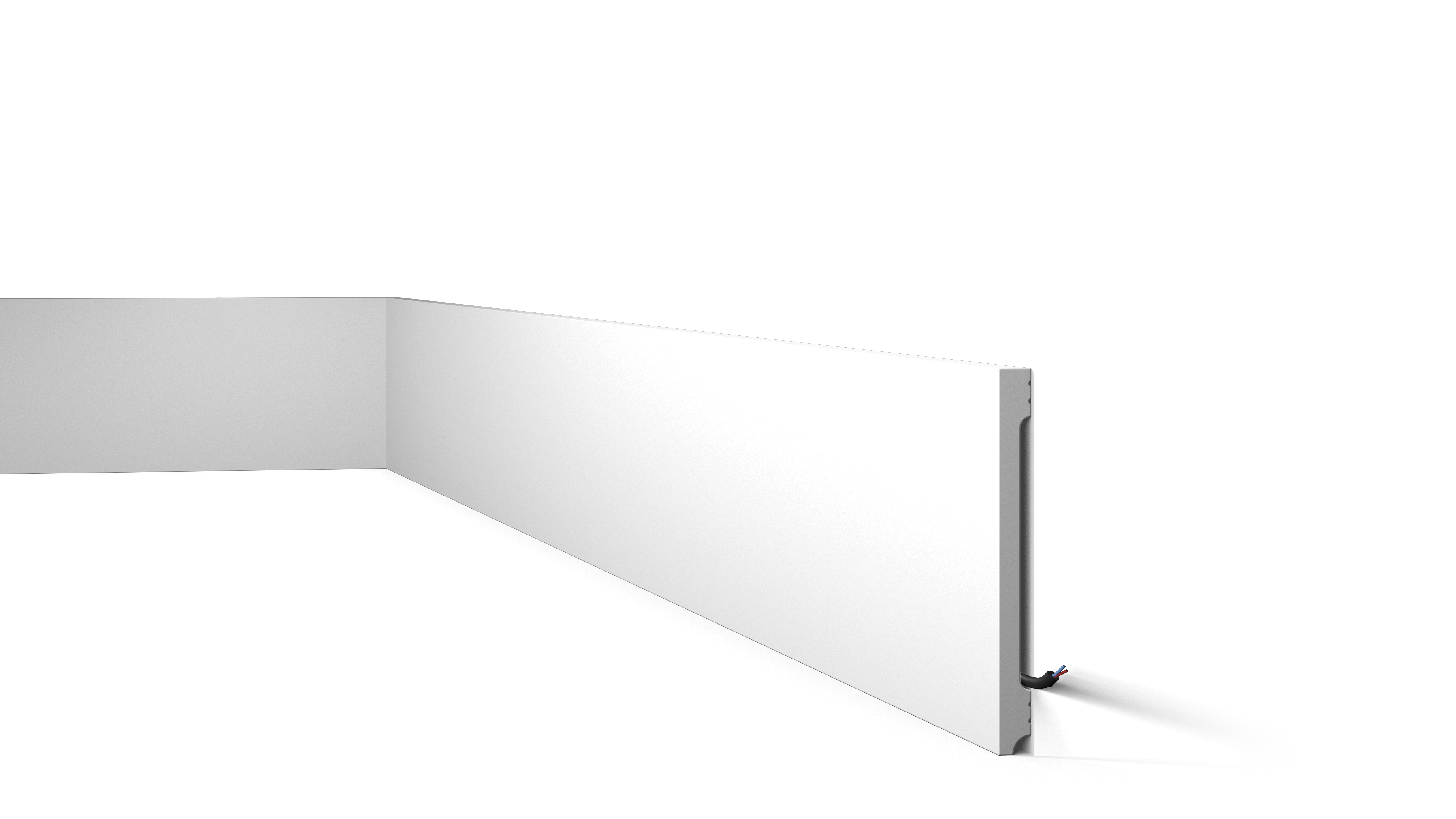 La plinthe FD20S WALLSTYL® est déjà apprêtée en usine prête à recevoir une couche de peinture finale. Un petit espace est prévu à l'arrière du modèle pour permettre de dissimuler les petits câblages ou les transitions inesthétiques. De plus, toutes nos plinthes sont réalisées avec 100 % d'énergie verte.