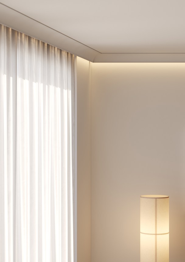 Au croisement de nos collections d'éclairage indirect et de corniches, la moulure de rideau IL18 WALLSTYL® présente un aspect intemporel, agrémenté d'une courbe élégante et de lignes nettes pour un fini impeccable. Combiné à un éclairage LED, il confère une ambiance douce et chaleureuse à votre intérieur, tout en conservant un look résolument moderne. Fabriqué en polystyrène haute densité, la moulure IL18 WALLSTYL® est conçue dans un style minimaliste, permettant de dissimuler harmonieusement votre tringle à rideaux pour un design contemporain.