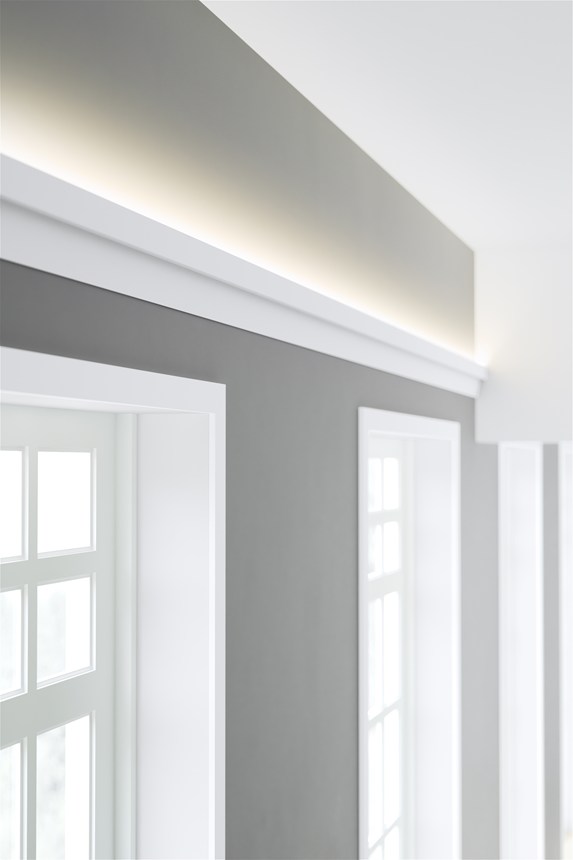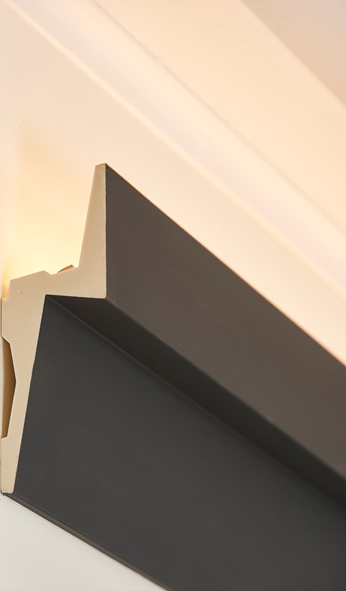 L’installation de la IL8 est simple car les moulures arrivent prêtes à peindre grâce à la couche de primaire appliquée en usine. Pour installer la moulure de plafond, il suffit de coller chaque section à l’endroit désiré. Un espace se trouve à l’arrière de la partie supérieure de la moulure IL8 pour dissimuler des bandes LED afin de créer un éclairage indirect.
