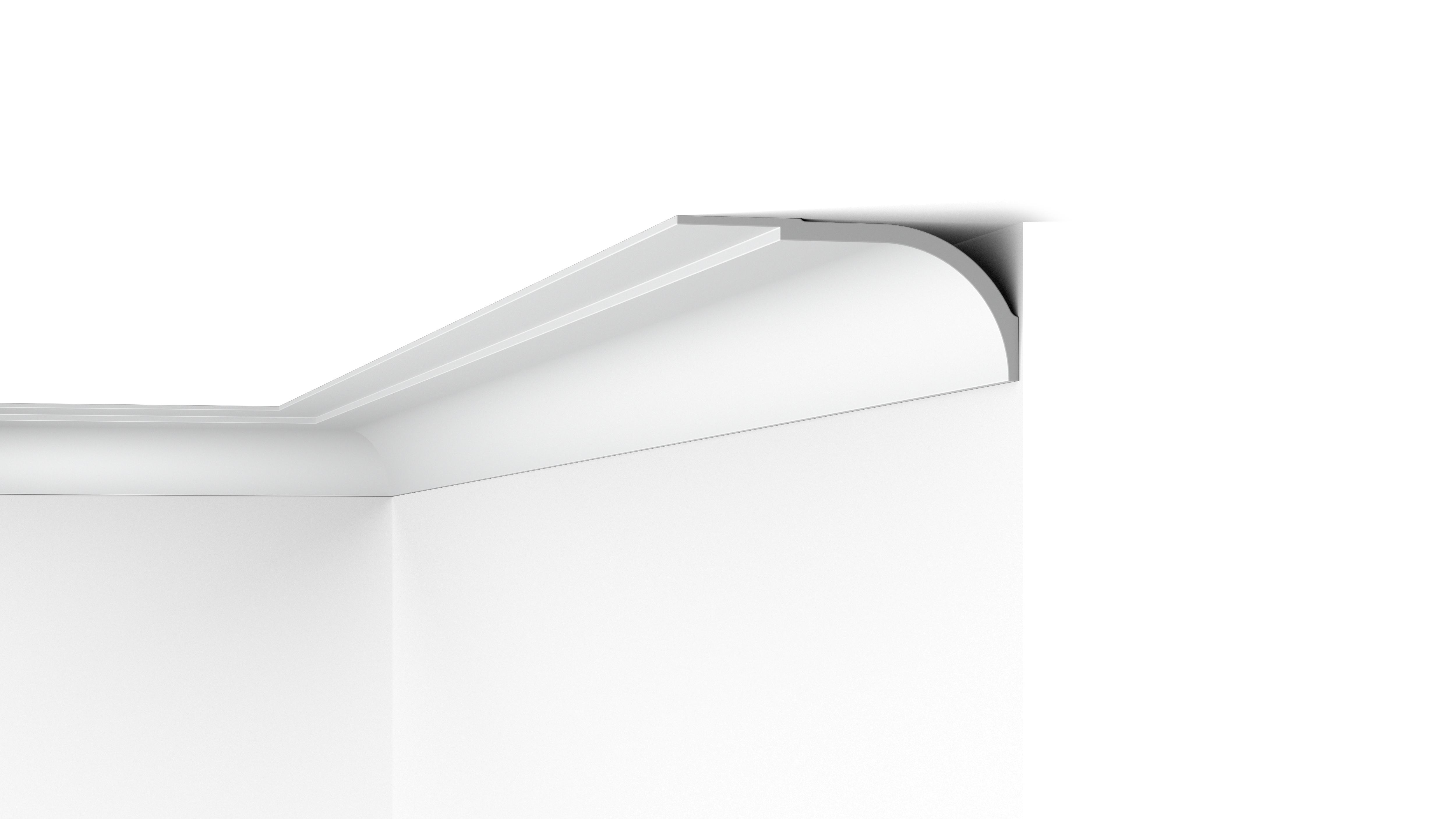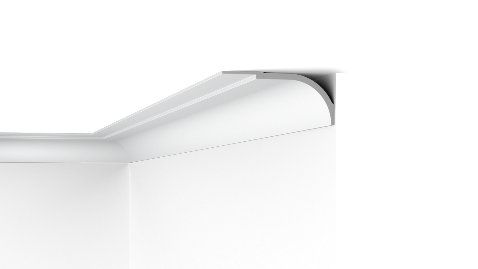 Une moulure de plafond réversible comme la WT22 WALLSTYL® offre deux possibilités de pose pour différents résultats. Installez le côté le plus long sur le plafond pour augmenter visuellement la largeur de la pièce, ou sur le mur pour augmenter la hauteur de la pièce. Ce produit a une forme simple qui combine une courbe lisse avec un contour géométrique.