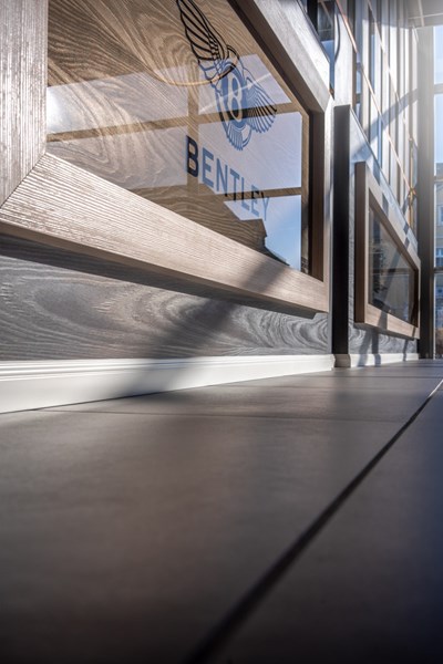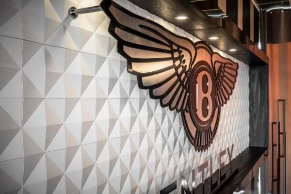Malgré la sobriété, l’imposant mur arrière en panneaux muraux 3D de Noël & Marquet (modèle Pyramid), avec son logo Bentley de 170 cm de large, permet de situer sans aucun doute l’endroit où l’on se trouve. Le message et l’image de la marque sont si bien mis en scène que certains passionnés d’automobile ne pourront jamais prendre assez de photos souvenirs, confirme l’équipe de vente Bentley.