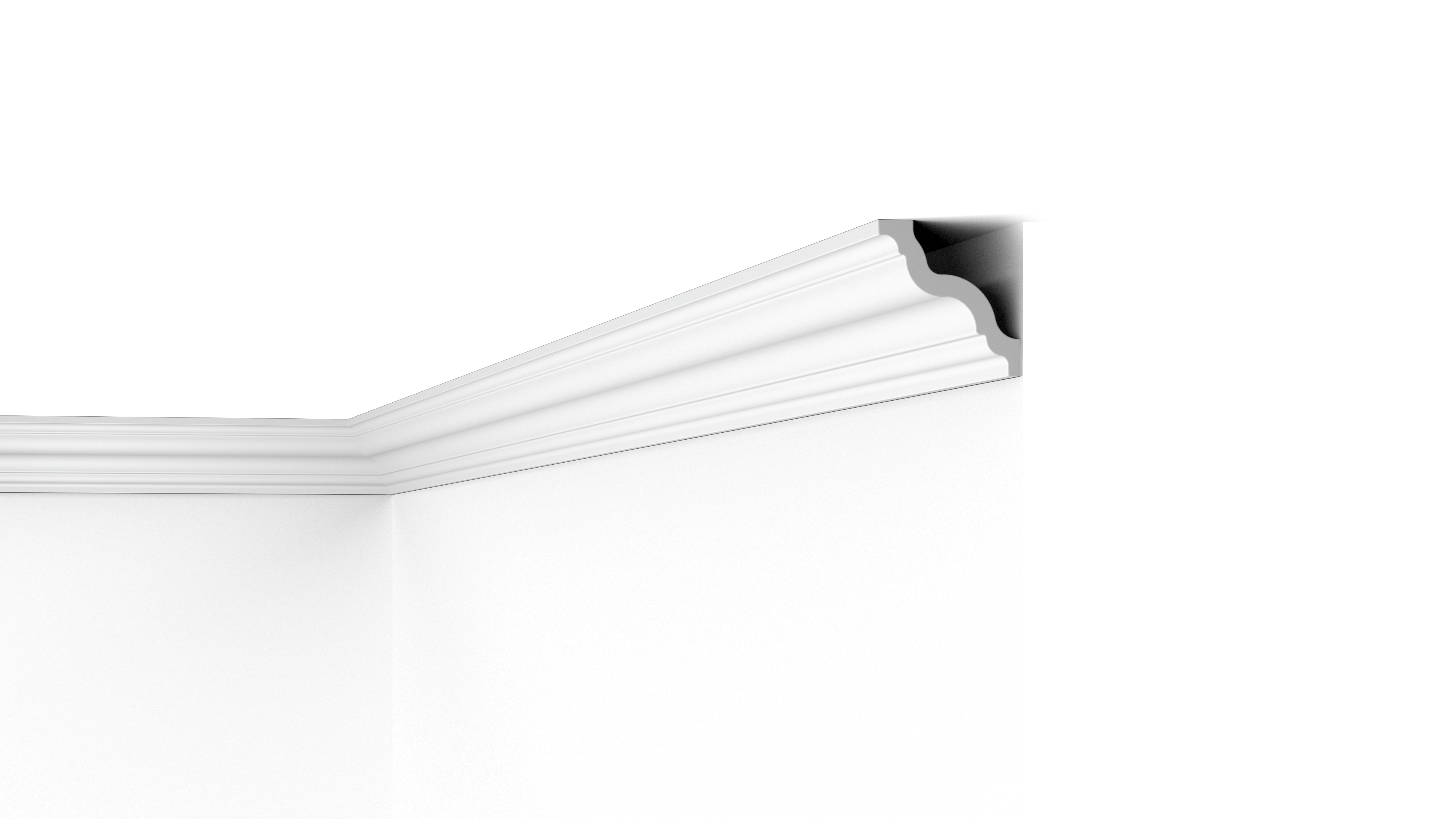 Integreer een gestructureerde overgang van muur naar plafond met de gedetailleerde GR NOMASTYL® kroonlijst. Een afgerond, S-vormig profiel zorgt voor schaduwwerking, wat een ruimte interessanter maakt. De combinatie van strakke lijnen en een gebogen vorm zorgt voor een subtiele en geraffineerde blikvanger.