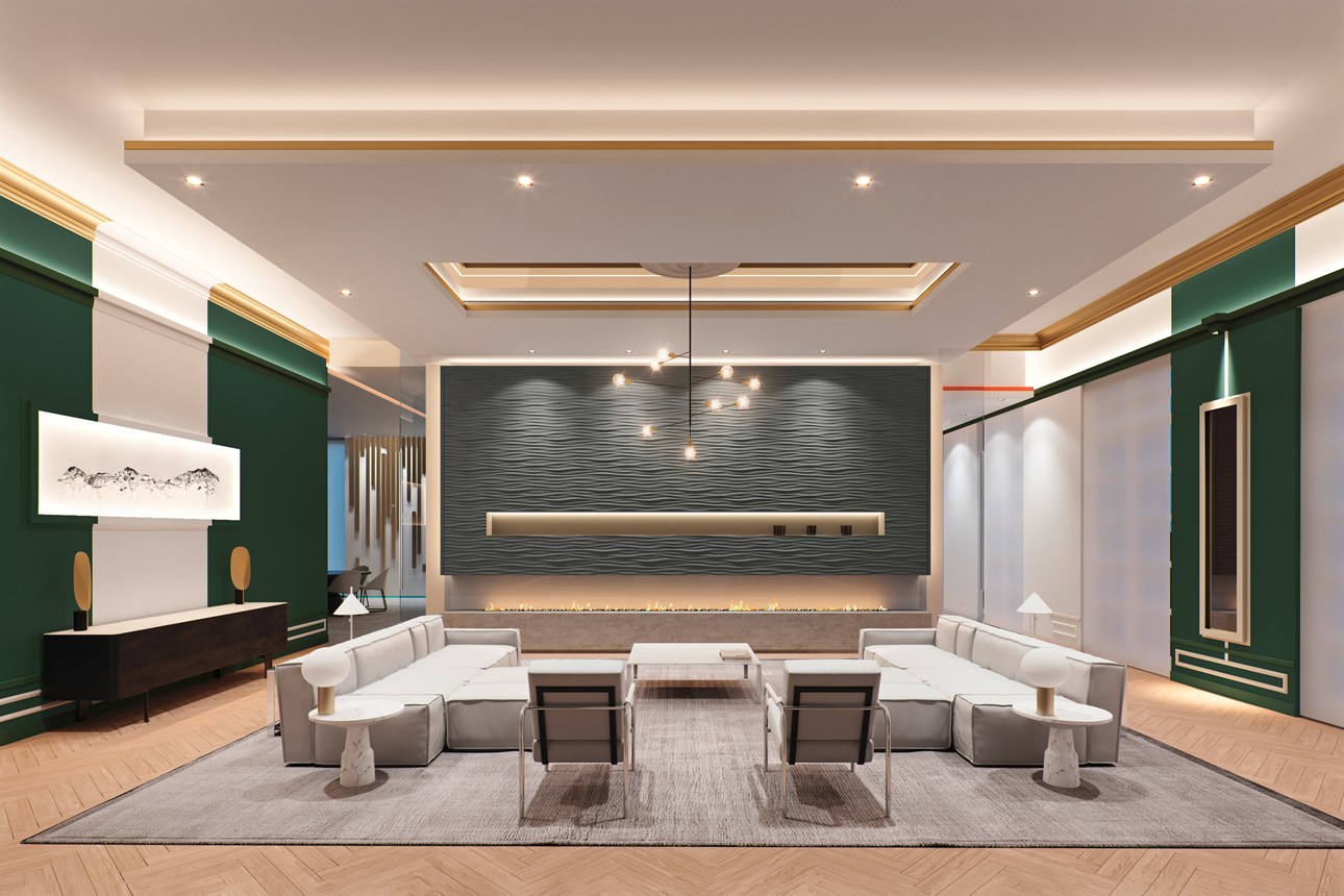 Decoração de parede com painéis de parede, revestimento, rosetas e rodapés para dar um toque moderno ao seu interior.