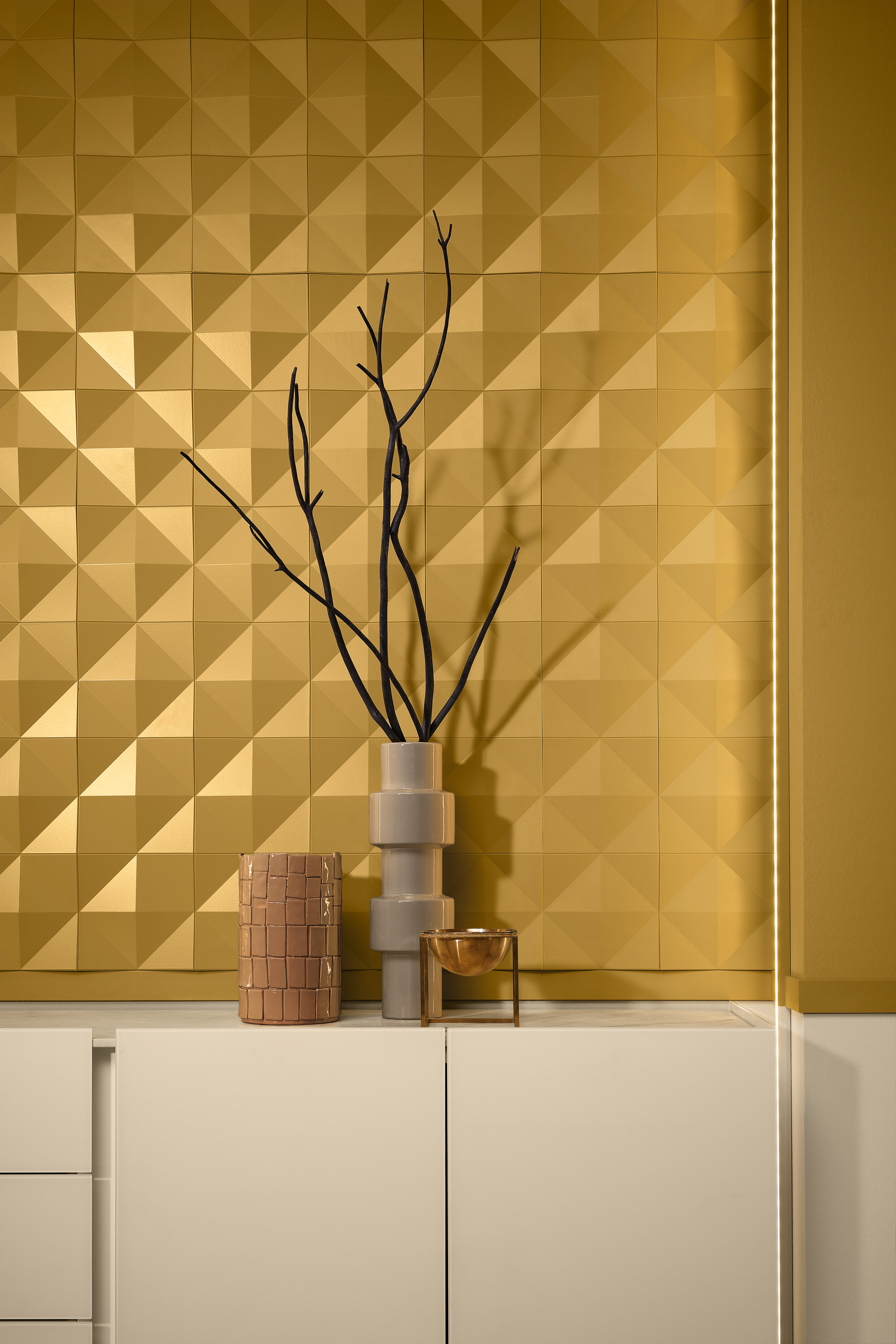 Cornijas, guardas, rodapés e decoração de parede que combinam com iluminação direta ou indireta. Para criar uma atmosfera