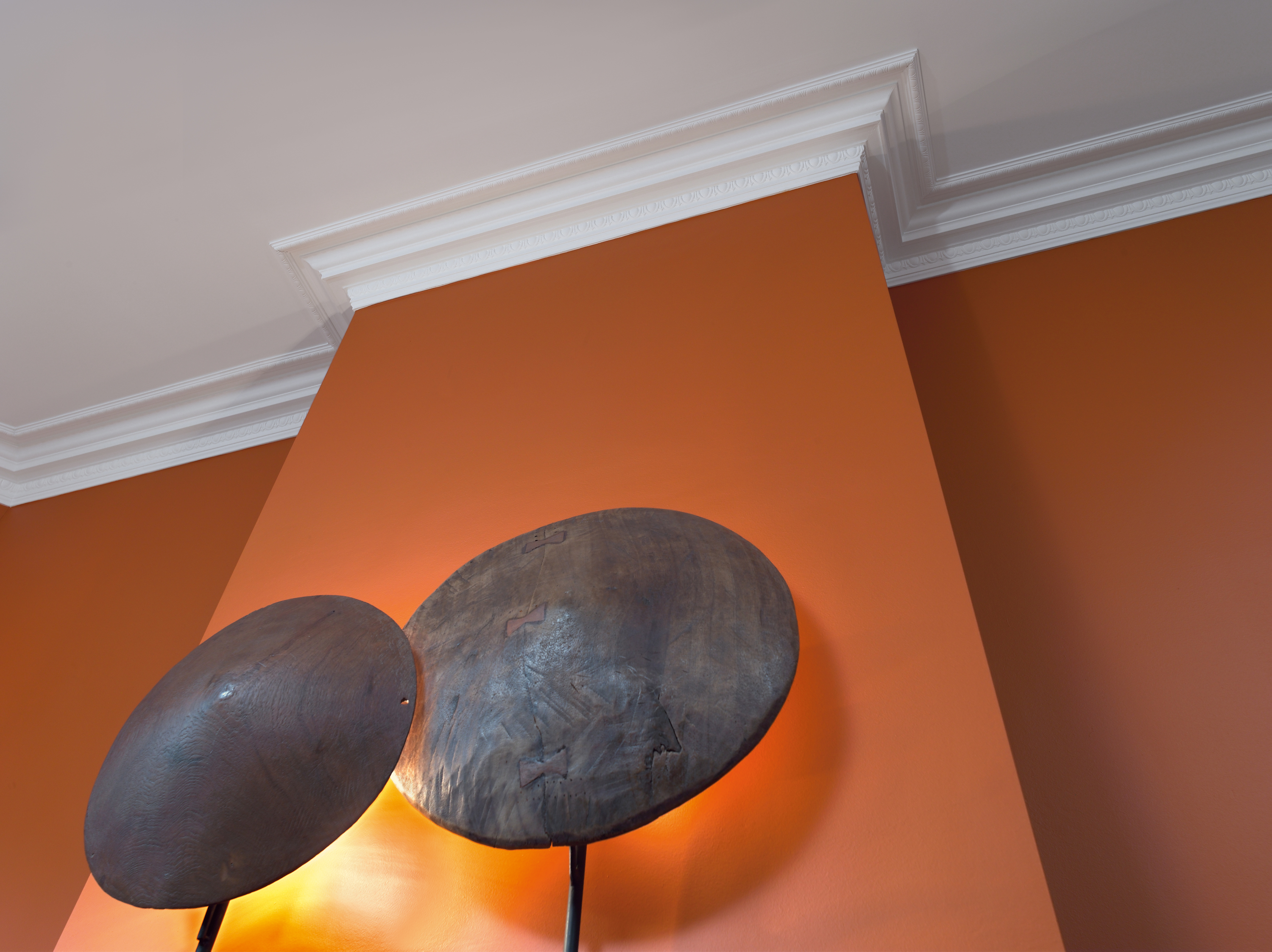 Cornijas, guardas, rodapés e decoração de parede que combinam com iluminação direta ou indireta. Para criar uma atmosfera