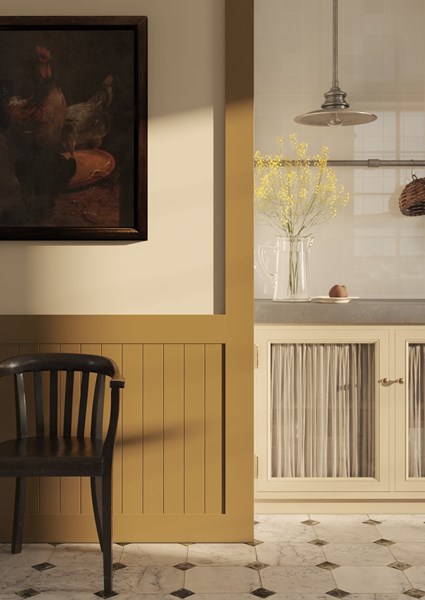 In the staircase, the combination of the wainscotting with the chair rails perfectly embodies the vibrant atmosphere of the cottage.