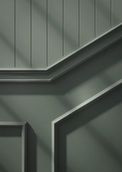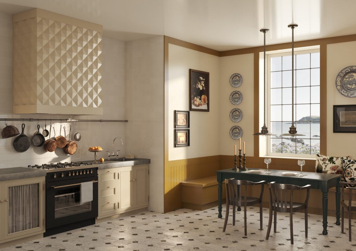 The kitchen hood becomes an unexpected eyecatcher, covered with our Pyramid wall panels.